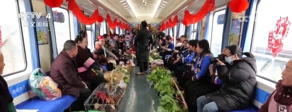 在貴州,有一趟往返于貴陽與玉屏之間的“慢火車”5640次列車,里面專設了一個農(nóng)特產(chǎn)品車廂。新春臨近,村民們將自家養(yǎng)殖的土雞、雞蛋,熏制的香腸、臘肉,以及水果、蔬菜帶上列車,向旅客現(xiàn)場售賣。
