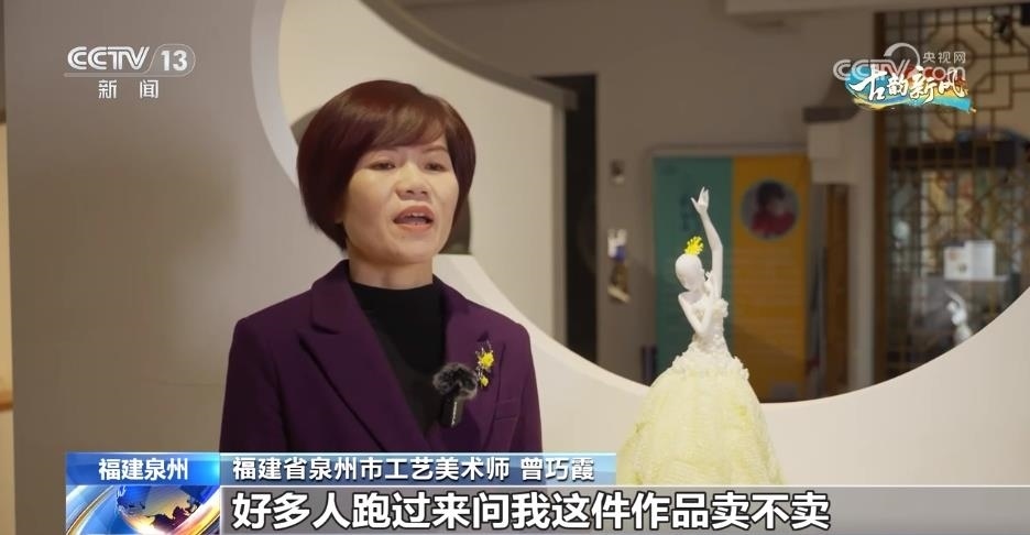福建省泉州市工藝美術(shù)師 曾巧霞:這件作品是以芭蕾舞的形式去表現(xiàn)的,然后結(jié)合我們德化這種薄胎和手捏花的工藝來表現(xiàn)整件作品。我把這件作品帶到國博去展出,好多人跑過來問我賣不賣,現(xiàn)在不是沒人要,是訂單多到已經(jīng)做不出來的問題了。