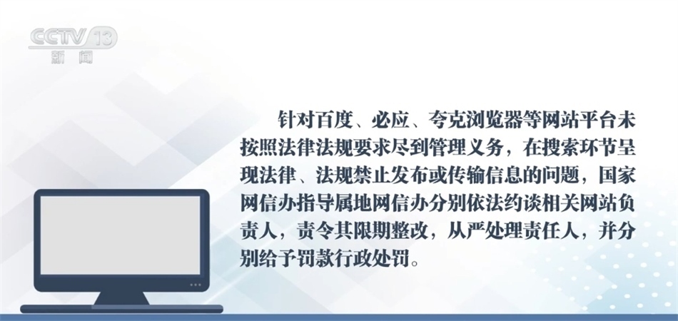 針對百度、必應(yīng)、夸克瀏覽器等網(wǎng)站平臺未按照法律法規(guī)要求盡到管理義務(wù),在搜索環(huán)節(jié)呈現(xiàn)法律、法規(guī)禁止發(fā)布或傳輸?shù)男畔栴},國家網(wǎng)信辦指導(dǎo)屬地網(wǎng)信辦分別依法約談相關(guān)網(wǎng)站負(fù)責(zé)人,責(zé)令其限期整改,從嚴(yán)處理責(zé)任人,并分別給予罰款行政處罰。