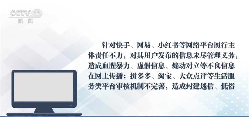 針對快手、網(wǎng)易、小紅書等網(wǎng)絡(luò)平臺履行主體責(zé)任不力,對其用戶發(fā)布的信息未盡管理義務(wù),造成血腥暴力、虛假信息、煽動對立等不良信息在網(wǎng)上傳播;拼多多、淘寶、大眾點評等生活服務(wù)類平臺審核機制不完善,造成封建迷信、低俗色情信息在網(wǎng)上傳播等問題,國家網(wǎng)信辦指導(dǎo)屬地網(wǎng)信辦分別依法約談相關(guān)網(wǎng)站負(fù)責(zé)人,責(zé)令其限期整改,處置相關(guān)賬號,從嚴(yán)處理責(zé)任人,并分別給予警告、罰款等行政處罰。