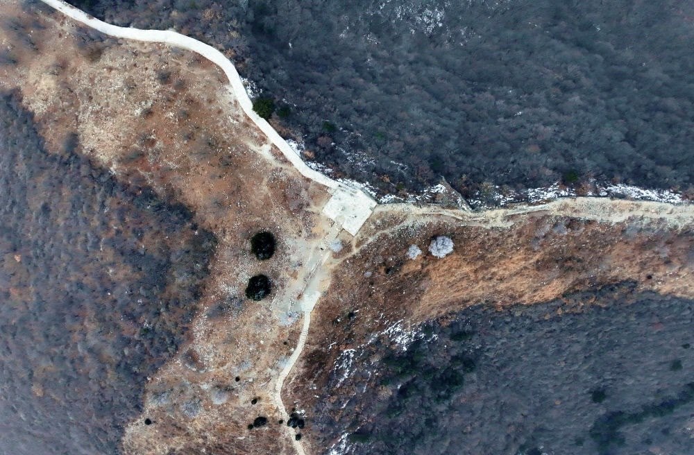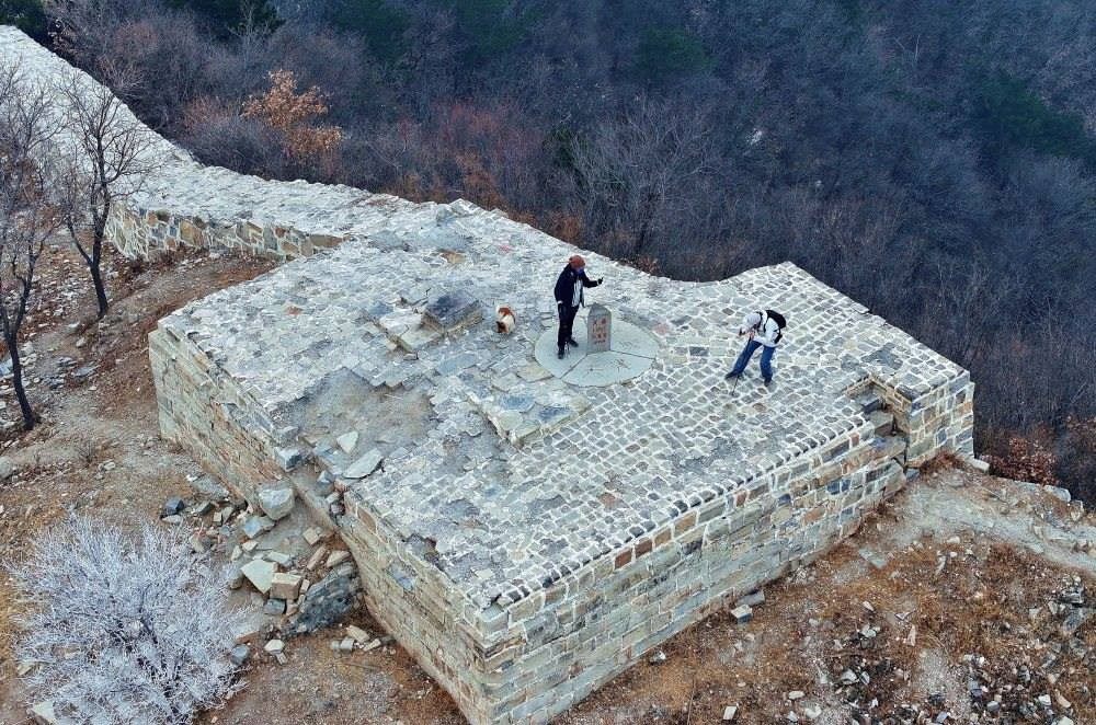 這是位于北京平谷、天津薊州、河北承德交界處的三界碑,以長(zhǎng)城和山脊為界劃分出北京、天津和河北三地(2024年1月30日攝,無(wú)人機(jī)照片)。新華社記者 趙子碩 攝