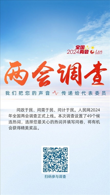 人民網(wǎng)北京2月5日電 (記者 黃子娟)人民網(wǎng)2024年全國兩會調(diào)查于今日正式上線,這是人民網(wǎng)連續(xù)23年開展全國兩會調(diào)查。網(wǎng)友可通過人民網(wǎng)2024年全國兩會調(diào)查專題、“人民網(wǎng)+”客戶端、人民網(wǎng)法人微博、人民網(wǎng)官方微信、“學(xué)習(xí)大國”微信公眾號等全媒體通道進(jìn)入調(diào)查頁面,選擇您最關(guān)心的熱詞并填寫調(diào)查問卷。