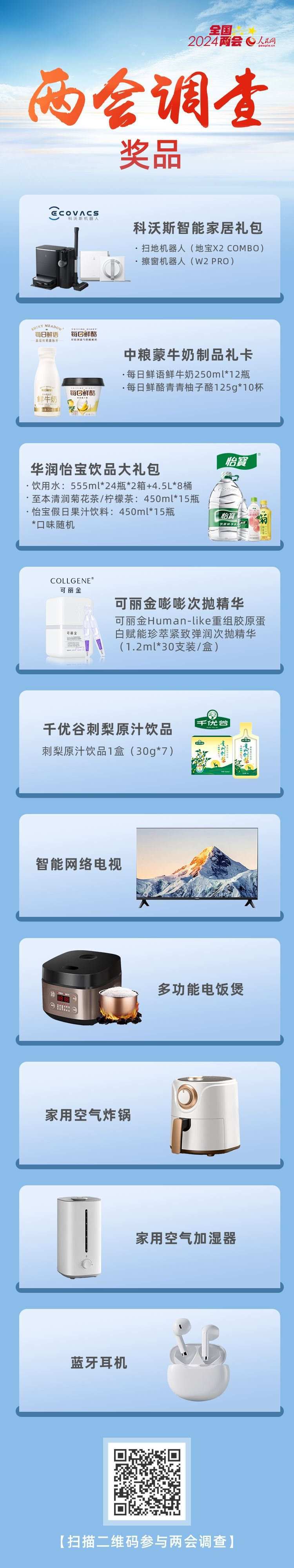 為感謝網(wǎng)友對全國兩會調(diào)查的支持,參與人民網(wǎng)2024年全國兩會調(diào)查還有機(jī)會抽取精美獎(jiǎng)品。