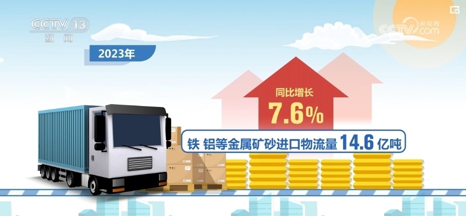 2023年,進(jìn)口物流總額18.0萬億元,同比增長13.0%,進(jìn)口物流量保持快速恢復(fù)態(tài)勢。原油、天然氣、煤炭等能源產(chǎn)品進(jìn)口物流量11.6億噸,同比增長27.2%,鐵、鋁等金屬礦砂進(jìn)口物流量14.6億噸,同比增長7.6%。