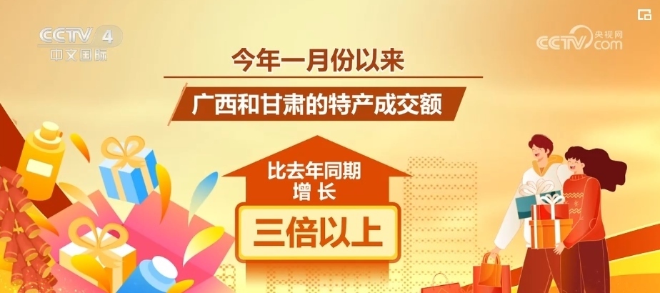 各大商場、超市、線上平臺均迎來銷售高峰。某購物平臺數(shù)據(jù)顯示,2024年1月份以來,廣西和甘肅的特產(chǎn)成交額比同比增長了三倍以上。廣西的砂糖橘、羅漢果茶,甘肅的蓋碗茶、百合干格外火熱。河南、天津、貴州等10個省份的特產(chǎn)成交額同比增長了一倍以上。