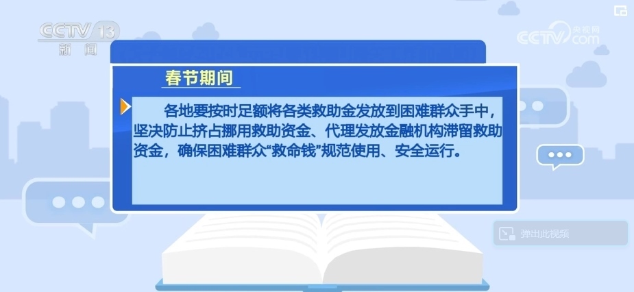 各地要按時足額將各類救助金發(fā)放到困難群眾手中,堅決防止擠占挪用救助資金、代理發(fā)放金融機構滯留救助資金,確保困難群眾“救命錢”規(guī)范使用、安全運行。