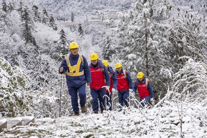 2月9日,在彭水縣中嶺山,國(guó)網(wǎng)重慶電力員工對(duì)電力線路開展冰雪特巡。牟偉攝