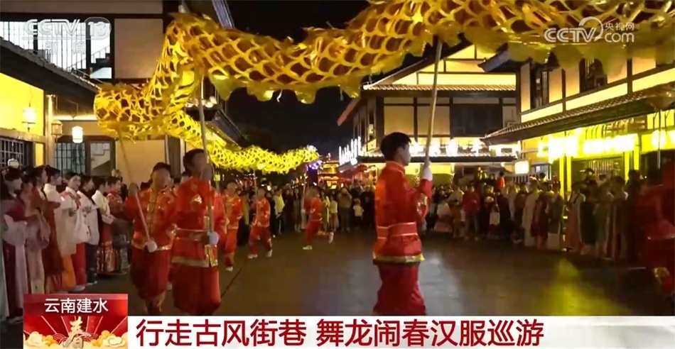 在云南紅河州建水縣紫陶里漢唐街區(qū),一場舞龍鬧春漢服巡游活動拉開了序幕。舞龍隊伍一路閃轉(zhuǎn)騰挪,一條黃色長龍奮力舞動,忽高忽低,飄忽飛逸。身著華美漢服的姑娘行走在古風(fēng)街巷間,一種古樸幽遠(yuǎn)的韻味撲面而來。市民與游客在感受建水年味的同時,也體驗到中華傳統(tǒng)文化之美。