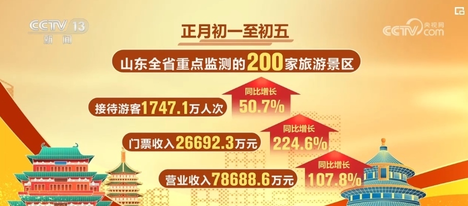 正月初一至初五,山東全省重點(diǎn)監(jiān)測(cè)的200家旅游景區(qū),累計(jì)接待游客超過1747萬人次,門票收入超2.6億元,營(yíng)業(yè)收入超7.8億元,與上年同期相比,分別增長(zhǎng)50.7%、224.6%、107.8%。