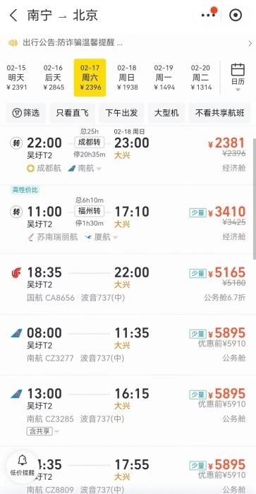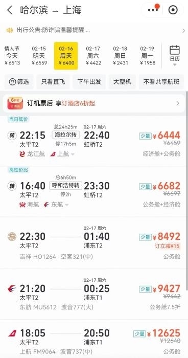 另外,如果條件允許,錯(cuò)峰返程也是個(gè)好辦法。例如,從哈爾濱到北京,17日機(jī)票最低需要6000多元,但如果選擇19日回,機(jī)票價(jià)格降到1500元左右,直接省下4000多元。同樣的情況也發(fā)生在哈爾濱到上海、三亞到重慶等航線上。