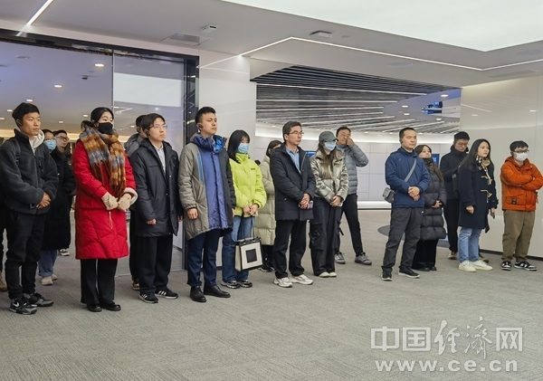 2023年12月18日,浙江大學師生代表隨團在浙江杭州中國視谷調(diào)研。左二為浙江大學學生蔡安禧,左三為浙江大學學生金姚烗,左四為浙江大學馬克思主義學院教師陳曉偉。(中國經(jīng)濟網(wǎng)記者 王巖/攝)