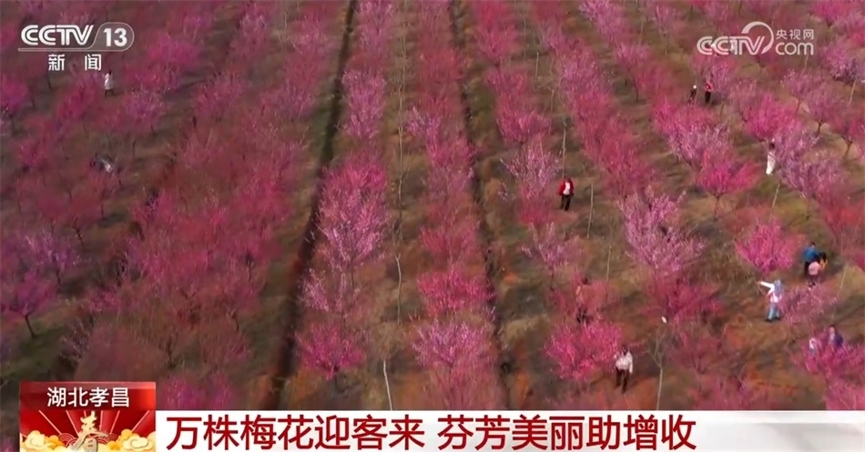 在湖北孝感孝昌縣鄒崗鎮(zhèn),萬株梅花也競(jìng)相綻放,吸引了眾多市民游客來此“尋梅”。走進(jìn)梅園,一簇簇梅花綴滿枝頭,蜜蜂飛舞其間,市民游客漫步在花海中,拍照記錄美好風(fēng)景。