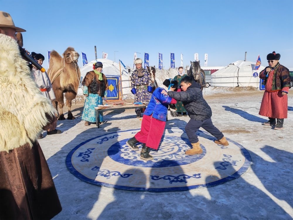 為迎接“十四冬”,呼倫貝爾推出了豐富多彩的文化活動(dòng)和產(chǎn)品。陳巴爾虎旗的牧民巴圖蘇和與合伙人在莫爾格勒河景區(qū)推出“天天冰雪那達(dá)慕”活動(dòng),設(shè)雪地搏克、騎馬射箭、“冰地嘎拉哈”、駱駝爬犁等項(xiàng)目,讓游客沉浸式體驗(yàn)蒙古族文化與傳統(tǒng)運(yùn)動(dòng)。首次嘗試雪地搏克的河北固安游客張瑞堂,與一位蒙古族少年友好競技,他的姐姐則用手機(jī)記錄下了這段珍貴的經(jīng)歷。