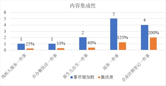 從內(nèi)容集成度看,5項(xiàng)相關(guān)“一件事”的事項(xiàng)集成比例均有不同程度提升?!皻埣踩朔?wù)一件事”增加1個(gè)事項(xiàng),集成度提升25%。“開(kāi)辦餐飲店一件事”增加1個(gè)事項(xiàng),集成度提升33%?!靶律鷥撼錾患隆痹黾?個(gè)事項(xiàng),集成度提升40%。“退休一件事”增加5個(gè)事項(xiàng),集成度提升125%?!捌髽I(yè)注銷登記一件事”增加4個(gè)事項(xiàng),集成度提升200%。