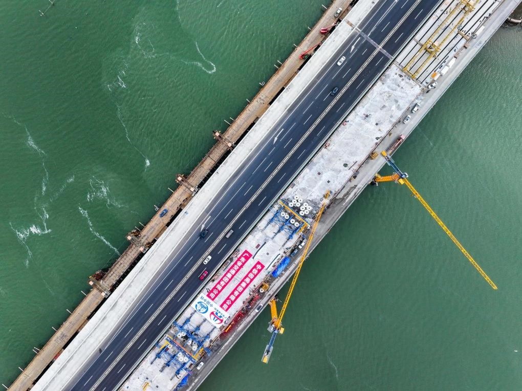 這是1月21日拍攝的深汕西高速長沙灣跨海特大橋(無人機照片)。當日,中鐵四局承建的深汕西高速改擴建項目長沙灣跨海特大橋左幅主跨合龍。新華社記者 劉大偉 攝