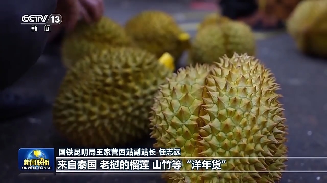 國鐵昆明局王家營西站副站長 任志遠(yuǎn):今年以來,車站進(jìn)出口貨物明顯增加,來自泰國、老撾的榴蓮、山竹等“洋年貨”源源不斷運(yùn)抵。國內(nèi)的“國貨潮牌”陸續(xù)運(yùn)往東南亞國家。