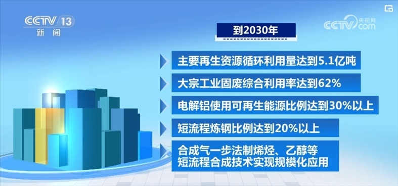 《指導意見》提出,到2030年,主要再生資源循環(huán)利用量達到5.1億噸,大宗工業(yè)固廢綜合利用率達到62%,電解鋁使用可再生能源比例達到30%以上,短流程煉鋼比例達到20%以上,合成氣一步法制烯烴、乙醇等短流程合成技術實現(xiàn)規(guī)模化應用。