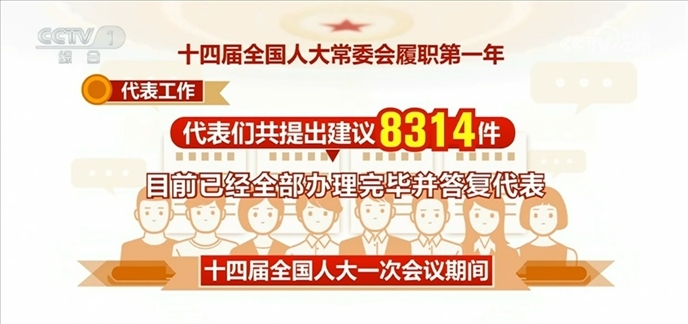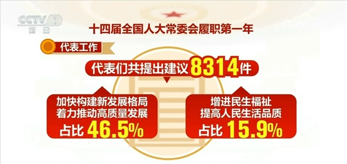 代表工作方面:十四屆全國人大一次會議期間,代表們共提出建議8314件,目前已經全部辦理完畢并答復代表。其中,涉及加快構建新發(fā)展格局、著力推動高質量發(fā)展的占比46.5%,涉及增進民生福祉、提高人民生活品質的占比15.9%。
