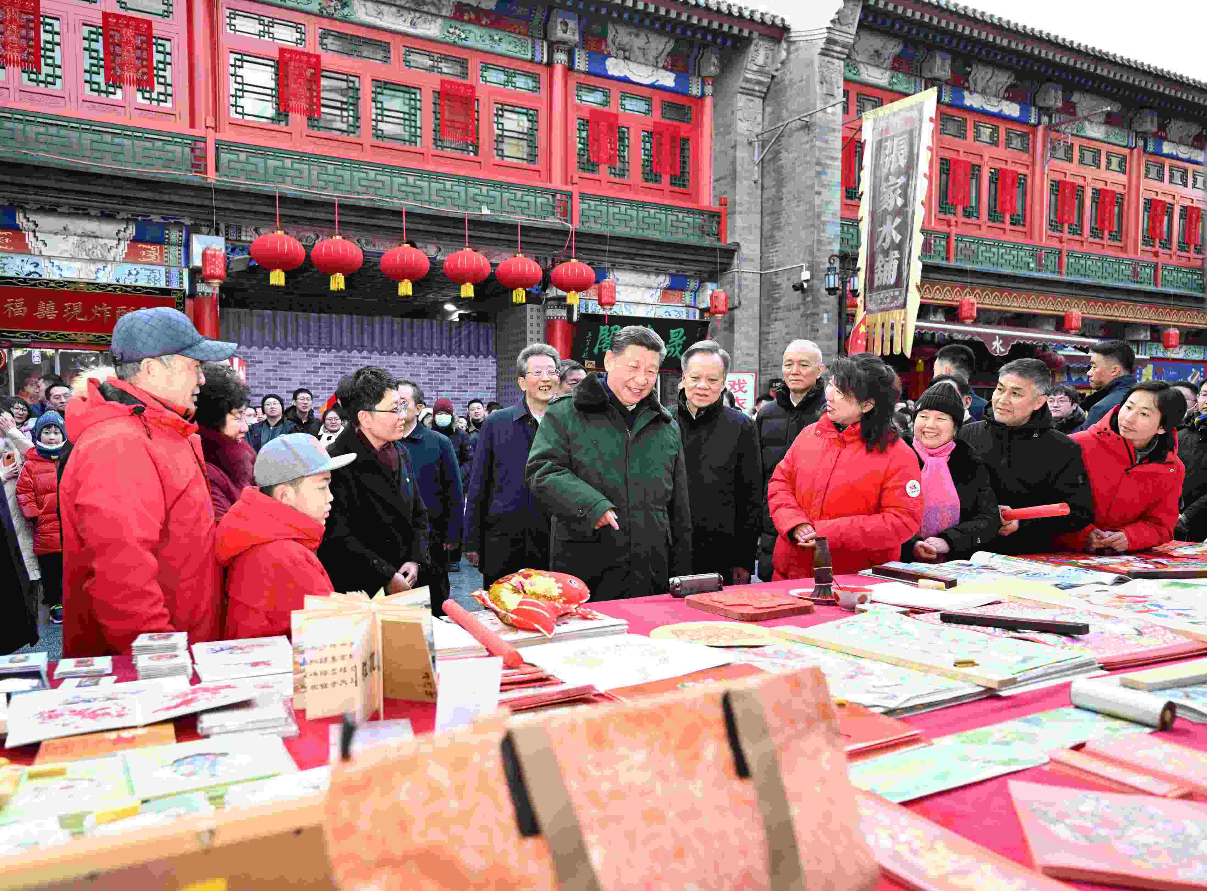 2月1日下午,總書記出現(xiàn)在了素有“津門故里”之稱的天津古文化街。在這個(gè)天津最早的經(jīng)濟(jì)、文化、商貿(mào)聚集地,總書記考察了歷史悠久的桂發(fā)祥十八街麻花、果仁張、泥人張、楊柳青年畫等“老字號”店鋪,向小朋友贈送麻花和栗子羹等天津特色傳統(tǒng)小吃,與群眾一起欣賞喜氣騰騰的“津味中國年”表演,看政通人和,品文脈傳承,溫故而知新。