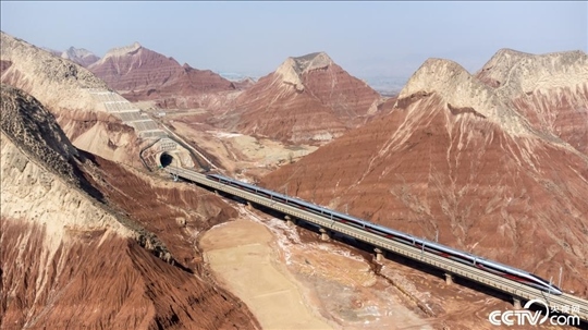 2024年3月3日,蘭州紅古區(qū)的七彩丹霞中,疾馳在蘭新高鐵上的動(dòng)車組列車從中穿越,中國速度與錦繡山河完美同框,格外壯美。