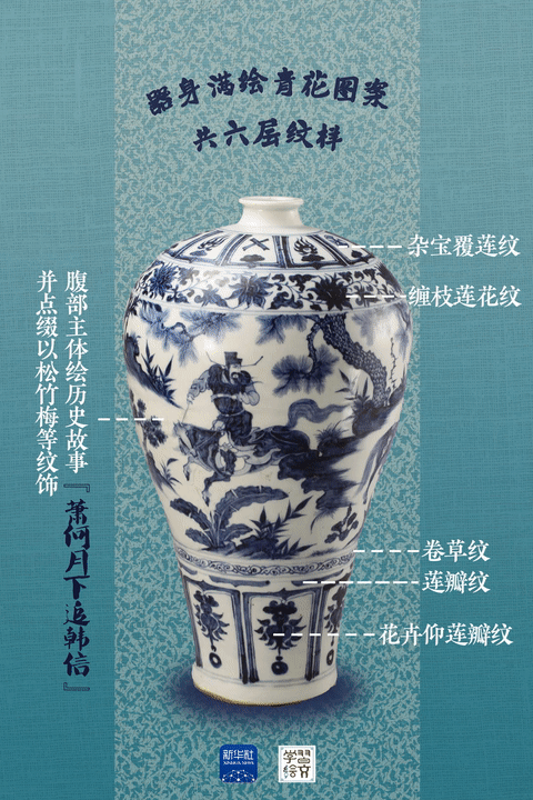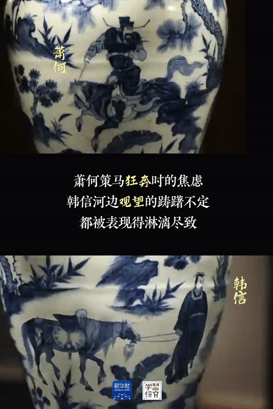 “元代是中國陶瓷史上不容忽視的重要時(shí)期。”宋燕介紹,這件藏于南京市博物館的元青花蕭何月下追韓信圖梅瓶向人們展示了元代制瓷水平。
