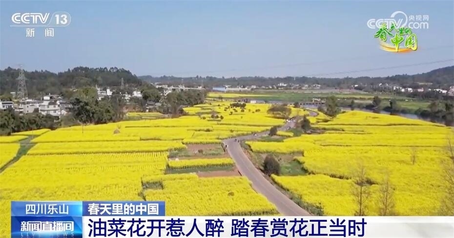 遠眺峨眉山,近看峨眉河,萬頃金波花如海,流金溢彩百里香。現在我們看到的是四川樂山市中區(qū) 永和村的近千畝油菜花,在陽光照射下,猶如斑斕的綢帶,妝點了峨眉河沿岸五彩的山色春光。趁著晴好天氣,市民、游客來到戶外踏青賞景,在花田中徜徉流連,感受春日美好時光。