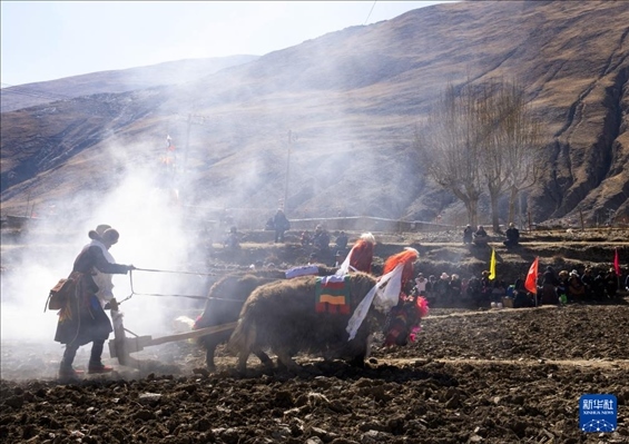 離村莊不遠(yuǎn)的一處農(nóng)田上,在百余名村民的注視下,12名壯年男子哼唱著古老的曲調(diào),驅(qū)趕耕牛耕出新年的第一犁?!稗r(nóng)業(yè)生產(chǎn)早就實(shí)現(xiàn)了機(jī)械化,之所以用傳統(tǒng)的‘二牛抬杠’來舉行開耕儀式,是為了更好地傳承高原農(nóng)耕文化。”加麻村委員會(huì)主任土旦說。