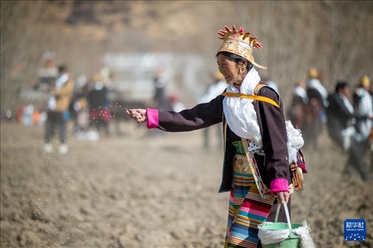 3月16日,在西藏山南市瓊結(jié)縣加麻鄉(xiāng)加麻村的春耕儀式現(xiàn)場,農(nóng)民播撒種子。新華社記者 旦增尼瑪曲珠 攝