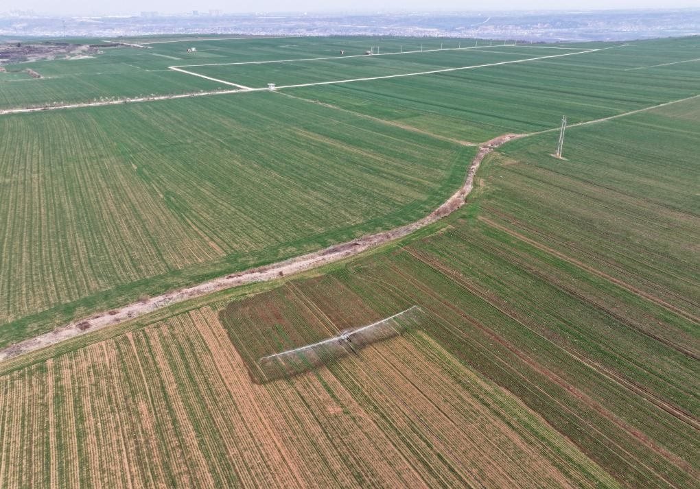 3月6日,在西安市長安區(qū)神禾塬萬畝優(yōu)質(zhì)糧食生產(chǎn)基地,長豐農(nóng)機專業(yè)合作社使用淋灌機澆灌小麥(無人機照片)。新華社記者邵瑞 攝