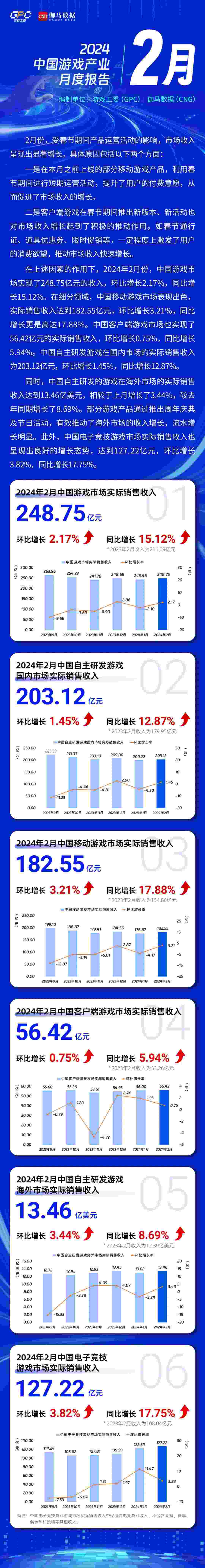 央視網(wǎng)消息:3月20日,據(jù)中國音數(shù)協(xié)游戲工委官微消息,2024年2月中國游戲產(chǎn)業(yè)月度報告發(fā)布。報告顯示,2024年2月份,中國游戲市場實現(xiàn)了248.75億元的收入,環(huán)比增長2.17%,同比增長15.12%。在細(xì)分領(lǐng)域,中國移動游戲市場表現(xiàn)出色,實際銷售收入達(dá)到182.55億元,環(huán)比增長3.21%,同比增長更是高達(dá)17.88%。中國客戶端游戲市場也實現(xiàn)了56.42億元的實際銷售收入,環(huán)比增長0.75%,同比增長5.94%。中國自主研發(fā)游戲在國內(nèi)市場的實際銷售收入為203.12億元,環(huán)比增長1.45%,同比增長12.87%。