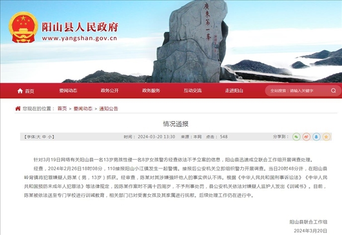 ·官方通報“13歲男孩性侵8歲女童警方不立案”:涉事男孩已被送至專門學校進行訓誡教育。