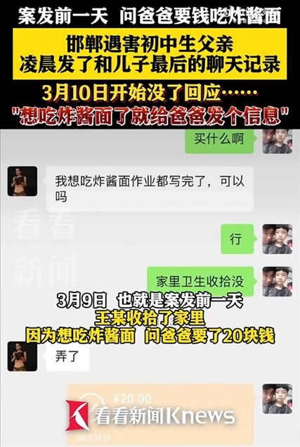 ·3月20日凌晨,邯鄲遇害初中生王某的父親發(fā)布了和兒子的聊天記錄。案發(fā)前一天,王某收拾了家里,因為想吃炸醬面,問爸爸要了20塊錢。