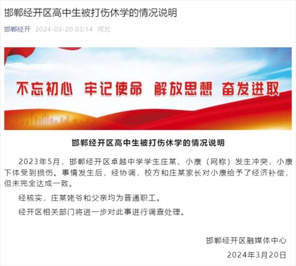 ·河北邯鄲一學生被同學打傷睪丸休學,打人者自稱姥爺是縣長,當?shù)赝▓蟆?/p>
