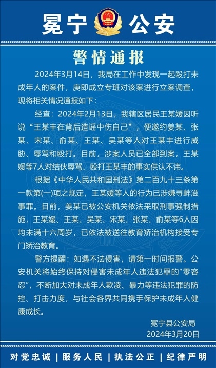 ·四川警方通報14歲女孩糾集多人圍毆男孩:1人被采取刑事強制措施,6人被送往教育矯治機構(gòu)。