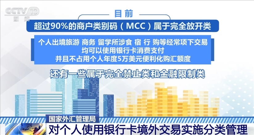 根據(jù)規(guī)定,目前,超過90%的商戶類別碼屬于完全放開類,個人出境旅游、商務(wù)、留學(xué)所涉食、宿、行、購等經(jīng)常項(xiàng)下交易,均可以使用銀行卡消費(fèi)支付,并且不占用個人年度5萬美元便利化購匯額度。此外,還有一些屬于完全禁止類和金融限制類。