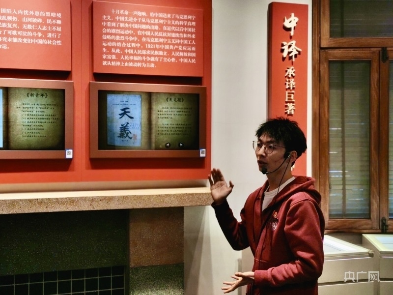 蔡薛文在《共產(chǎn)黨宣言》展示館內(nèi)講解(央廣網(wǎng)發(fā) 復旦大學黨委宣傳部供圖)
