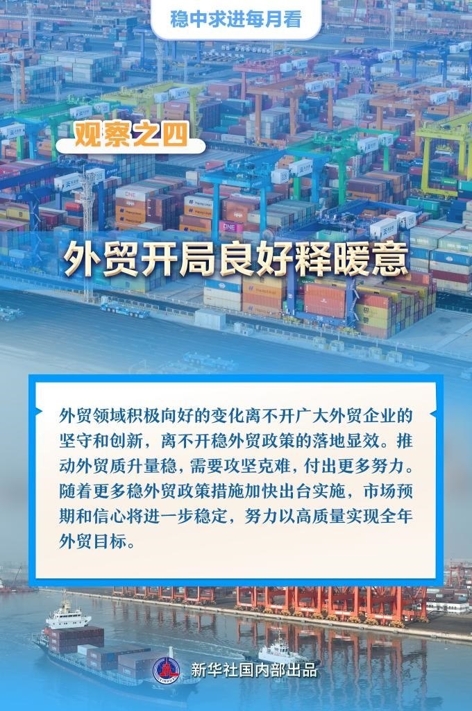 【記者觀察】外貿領域積極向好的變化離不開廣大外貿企業(yè)的堅守和創(chuàng)新,離不開穩(wěn)外貿政策的落地顯效。推動外貿質升量穩(wěn),需要攻堅克難,付出更多努力。隨著更多穩(wěn)外貿政策措施加快出臺實施,市場預期和信心將進一步穩(wěn)定,努力以高質量實現(xiàn)全年外貿目標。