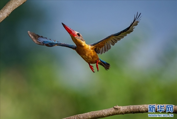 飛翔的鸛嘴翡翠(3月31日攝)。新華網(wǎng)發(fā)(高峰 攝)