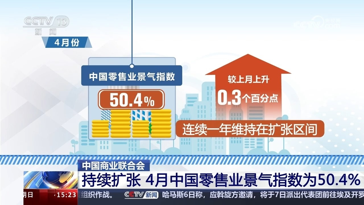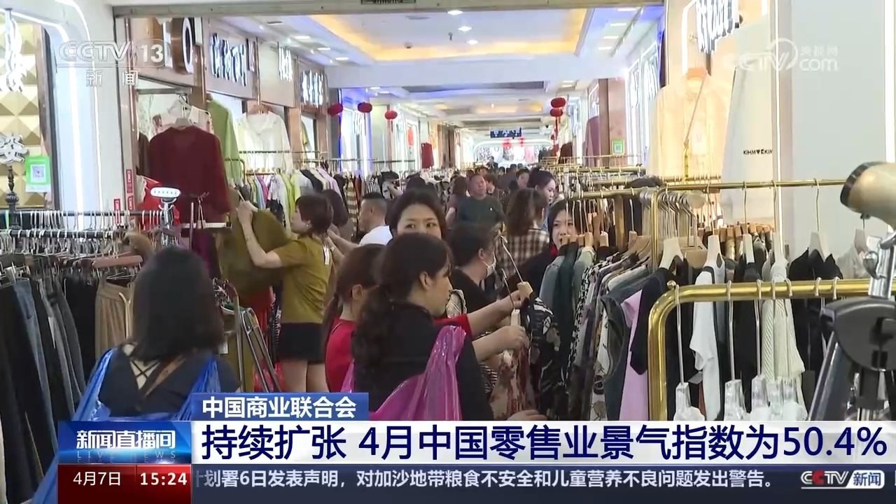 央視網(wǎng)消息:中國商業(yè)聯(lián)合會(huì)最新發(fā)布的中國零售業(yè)景氣指數(shù)顯示,4月份,中國零售業(yè)景氣指數(shù)為50.4%,連續(xù)一年維持在擴(kuò)張區(qū)間。全國商品經(jīng)營類企業(yè)對(duì)4月份盈利增長恢復(fù)的預(yù)期開始好轉(zhuǎn)。