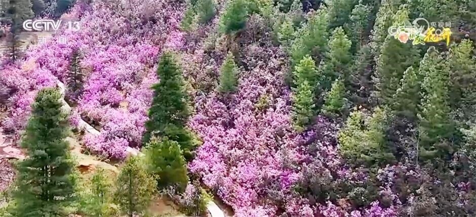跟隨鏡頭,我們來(lái)到云南省怒江州蘭坪縣,在海拔2810米的啦井鎮(zhèn)期井村,漫山遍野的野生杜鵑花競(jìng)相綻放。馬纓杜鵑、團(tuán)花杜鵑、假乳黃杜鵑、猴頭杜鵑……山谷里、山坡上,紅的、粉的、黃的,層層疊疊開滿枝頭,隨著山勢(shì)起伏跌宕,仿佛浪潮一般,形成了天然的花海。