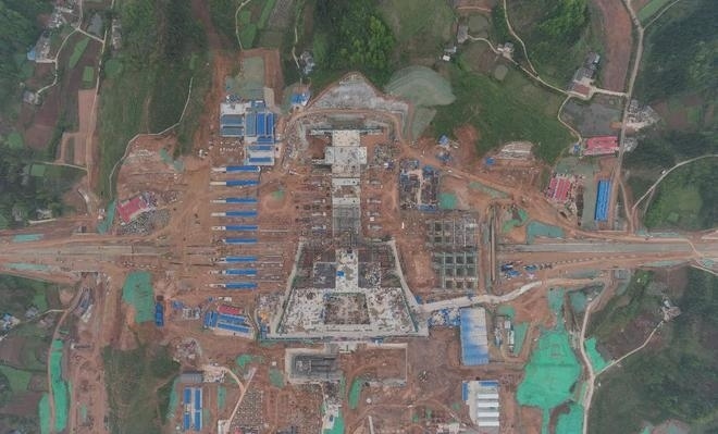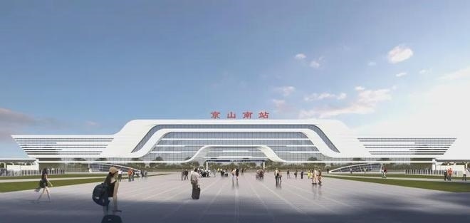 站房設(shè)計(jì)理念以“生態(tài)京山,觀鳥天堂”為主題,立面形成三層流暢的曲線造型,通過(guò)層層的推進(jìn),形成飛鳥展開的羽翼,打造舒展柔軟的建筑形象。設(shè)計(jì)提取京山“京”字筆畫,運(yùn)用抽象化建筑語(yǔ)言描摹“京”字之形,形成流暢的建筑形體。目前,車站樁基施工完畢,基礎(chǔ)承臺(tái)建設(shè)完成三分之二。