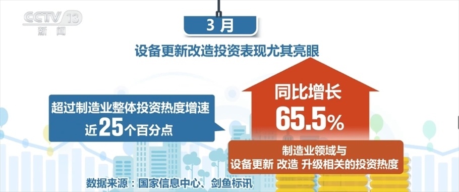 制造業(yè)領(lǐng)域則更為突出,1—2月,制造業(yè)投資熱度指數(shù)同比增長13.3%,3月迅速提升至40.6%,遠(yuǎn)高于全國總體投資熱度增速。設(shè)備更新改造投資表現(xiàn)尤其亮眼,3月,制造業(yè)領(lǐng)域與設(shè)備更新、改造、升級相關(guān)的投資熱度同比增長65.5%,超過制造業(yè)整體投資熱度增速近25個(gè)百分點(diǎn)。