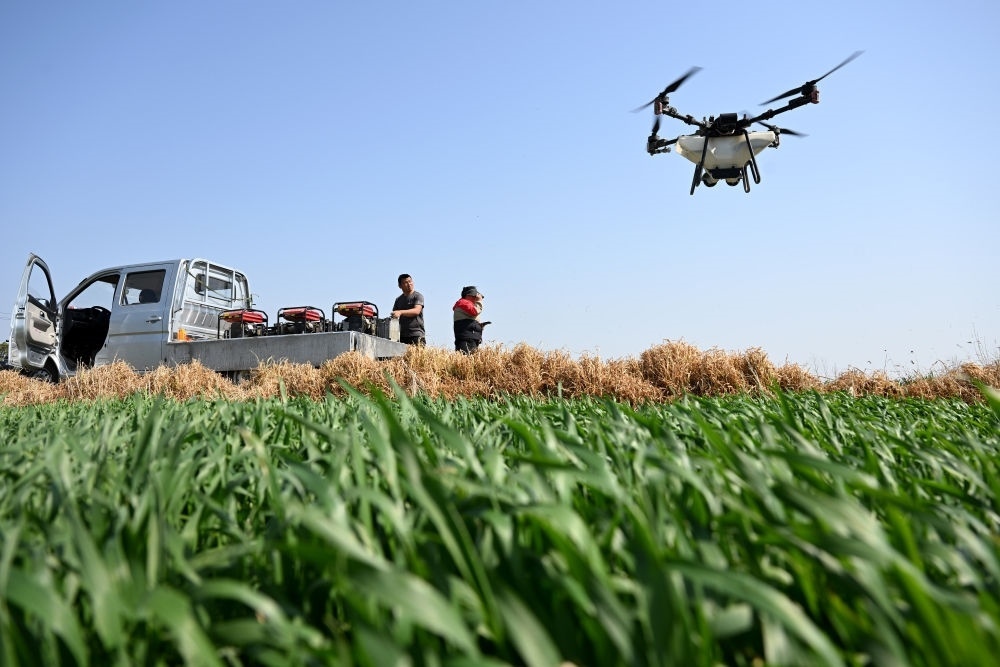 2024年3月22日,在安徽省合肥市廬江縣同大鎮(zhèn),工作人員操作植保無(wú)人機(jī)為小麥?zhǔn)┓?。新華社記者 黃博涵 攝