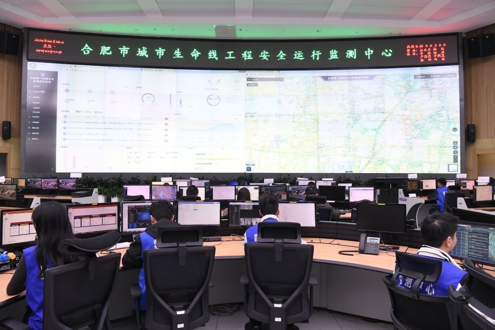 技術(shù)人員在位于清華大學(xué)合肥公共安全研究院的合肥市城市生命線工程安全運(yùn)行監(jiān)測(cè)中心值守(2024年4月8日攝)。合肥市2015年啟動(dòng)城市生命線安全工程建設(shè),逐步構(gòu)建燃?xì)狻蛄?、供水、排水、熱力、綜合管廊、消防、水環(huán)境八大領(lǐng)域立體化監(jiān)測(cè)網(wǎng),探索出一條以場(chǎng)景應(yīng)用為依托、以智慧防控為導(dǎo)向、以創(chuàng)新驅(qū)動(dòng)為內(nèi)核、以市場(chǎng)運(yùn)作為抓手的城市安全發(fā)展新模式。