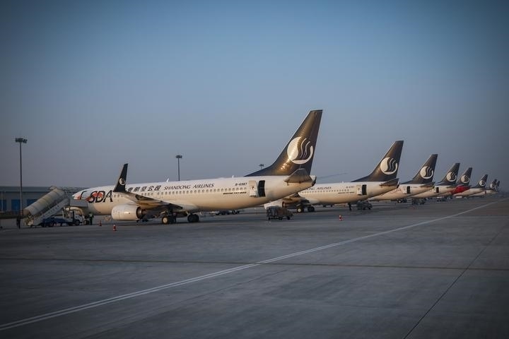 圖為山東航空在機場停靠的飛機。(山東航空供圖)