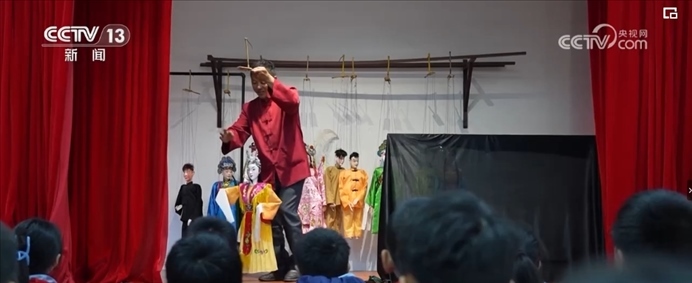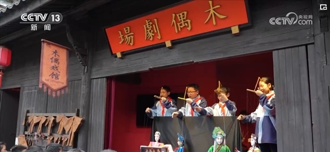 舞臺(tái)上,廿八都小學(xué)的同學(xué)們,一邊操縱木偶,一邊唱著臺(tái)詞,在非遺傳承人金宗懷的帶領(lǐng)下,正在演出他們最新排演的木偶戲。