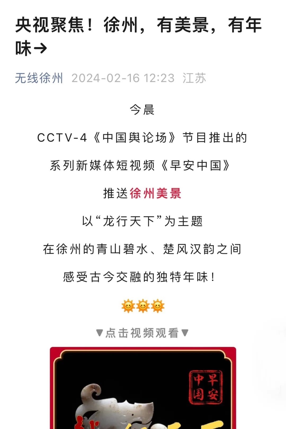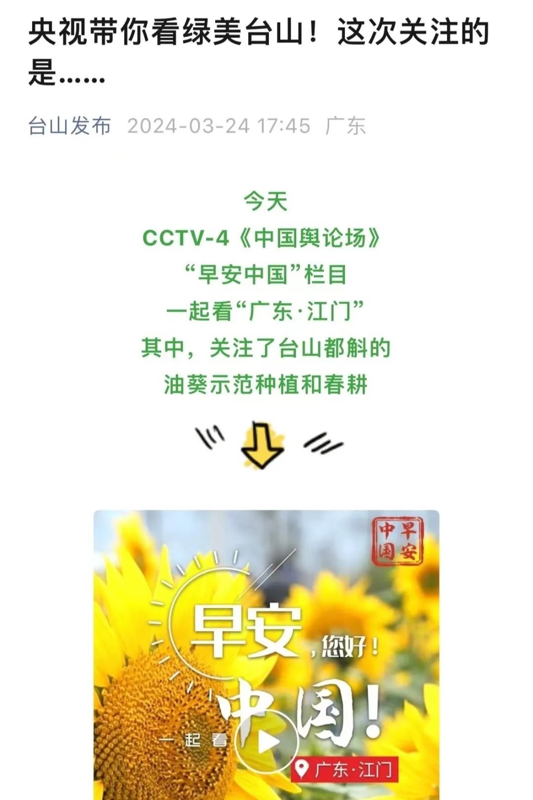“央視帶你看綠美臺山,這次關(guān)注的是......”“就在明早7點!央視奉上重慶大足人文美景,向全球觀眾道早安!”“央視聚焦!徐州,有美景,有年味”“金葵向陽開,中春好景和風(fēng)裁!美麗江門與您相遇央視《早安中國》”……越來越多的地方政府伸出橄欖枝,希望《早安中國》多“來”當(dāng)?shù)匾挥[好風(fēng)光。