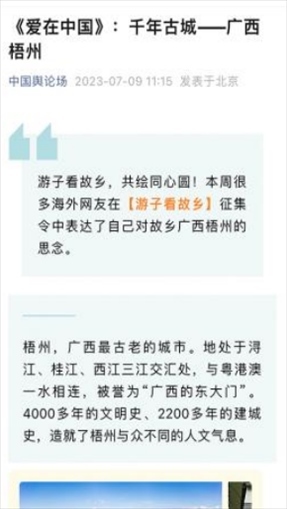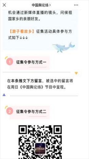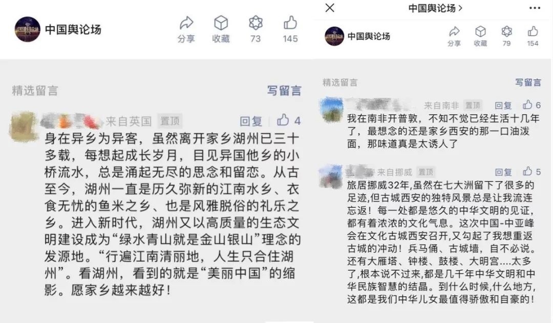 “早安中國切口新穎,有文化屬性和微記錄的氣質(zhì)。”“每次片尾的結(jié)語字幕,都是從哪里選的?每天,都給我學(xué)習(xí)的機會?!薄皩I(yè)微記錄是媒體融合最寬廣的路。”……《早安中國》真真切切地緩解了許多海內(nèi)外網(wǎng)友的故土思鄉(xiāng)情切,也收到了來自四面八方的認(rèn)可及反饋。《中國輿論場》節(jié)目持續(xù)發(fā)出“游子看故鄉(xiāng)”征集令,請海外華僑華人說出對家鄉(xiāng)的思念和心中最想“打卡”的祖國美景。