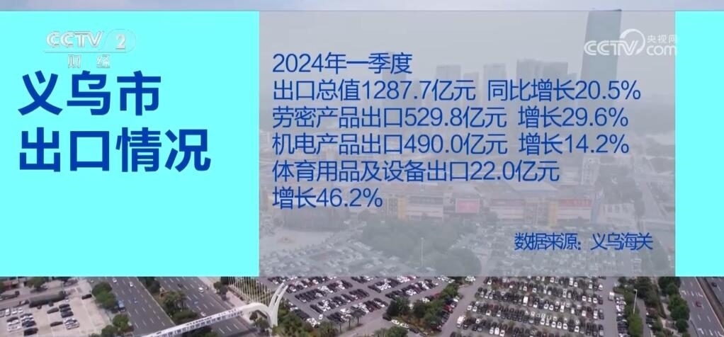 數(shù)據(jù)顯示,2024年一季度,義烏市出口總值達(dá)1287.7億元,同比增長20.5%。其中,勞密產(chǎn)品出口529.8億元,增長29.6%;機(jī)電產(chǎn)品出口490.0億元,增長14.2%;而體育用品及設(shè)備出口達(dá)到22.0億元,增長46.2%。業(yè)內(nèi)人士表示,巴黎奧運(yùn)會即將召開,以及外商圣誕采購季開始,歐美市場補(bǔ)庫存需求增加,使得相關(guān)產(chǎn)品出口占比顯著提升。