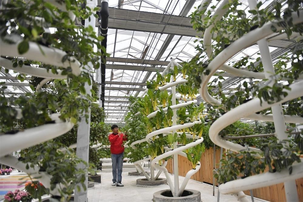 2023年5月13日,在河北曲周縣育苗產(chǎn)業(yè)園,苗樂園科技小院的學生在查看無土栽培蔬菜。